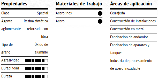 Una de las ventajas de este producto es su larga vida útil. Se trata de un disco de corte para aplicaciones profesionales con una alta agresividad y dureza. El producto es libre de hierro, sulfuro y cloro. El modelo A 46 TZ Special está disponible en una forma constructiva recta y abombada y con distintos diámetros, apropiados para diferentes amoladoras angulares.