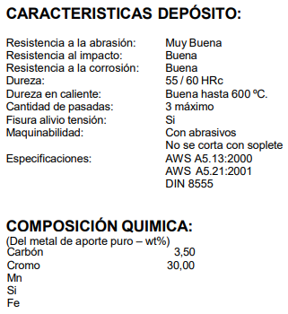 Varilla tubular; deposita un metal de soldadura con alto contenido de carburos de cromo que le otorgan muy buena resistencia a la abrasión con moderada resistencia al impacto. Depósito sin escoria, elevado rendimiento > 95%. Al ser varilla tubular requiere menores amperajes que productos similares de núcleo sólido lo que garantiza bajo niveles de dilución.