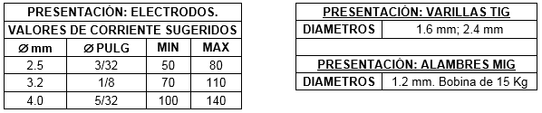 - Soldadura: Utilizar cualquier equipo, rectificador (corriente continua) con electrodo en positivo o transformador (corriente alterna). Cordones cortos.